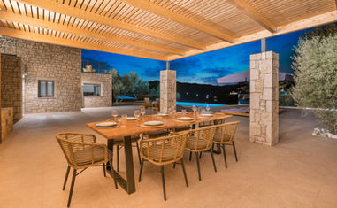 Enhancing the allure of this luxurious stone villa is a grand outdoor feature a large stone BBQ, perfect for indulging in the pleasures of al fresco dining. Imagine savoring delectable meals under the shade of a charming pergola, surrounded by the enchanting ambiance of the island. The spacious outdoor dining area offers an idyllic setting for gatherings and celebrations, where the tantalizing aroma of grilled delicacies mingles with the gentle sea breeze. Whether it's a casual brunch or a glamorous evening soirée, this enchanting space elevates outdoor living to new heights, creating unforgettable moments of culinary delight and cherished memories.